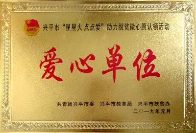2019年1月,在興平市“星星火,點點愛”助力脫貧微心愿認領(lǐng)活動中,寶塔山漆被共青團興平市委、興平市教育局、興平市扶貧辦評為“愛心單位”