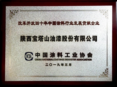 2019年3月,寶塔山漆被中國涂料工業(yè)協(xié)會評為“改革開放四十周年中國涂料行業(yè)發(fā)展貢獻企業(yè)”