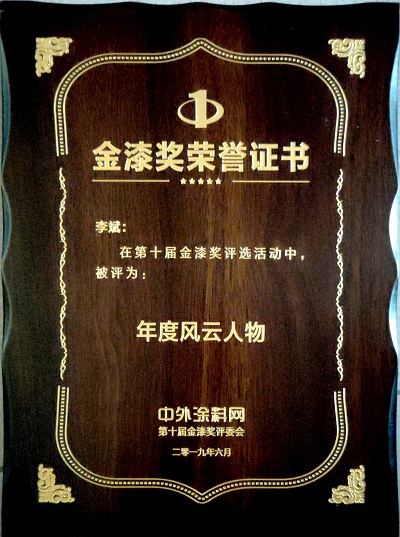 2019年6月,寶塔山漆李斌同志在中外涂料網(wǎng)第十屆金漆獎評選活動中被評為“年度風(fēng)云人物”