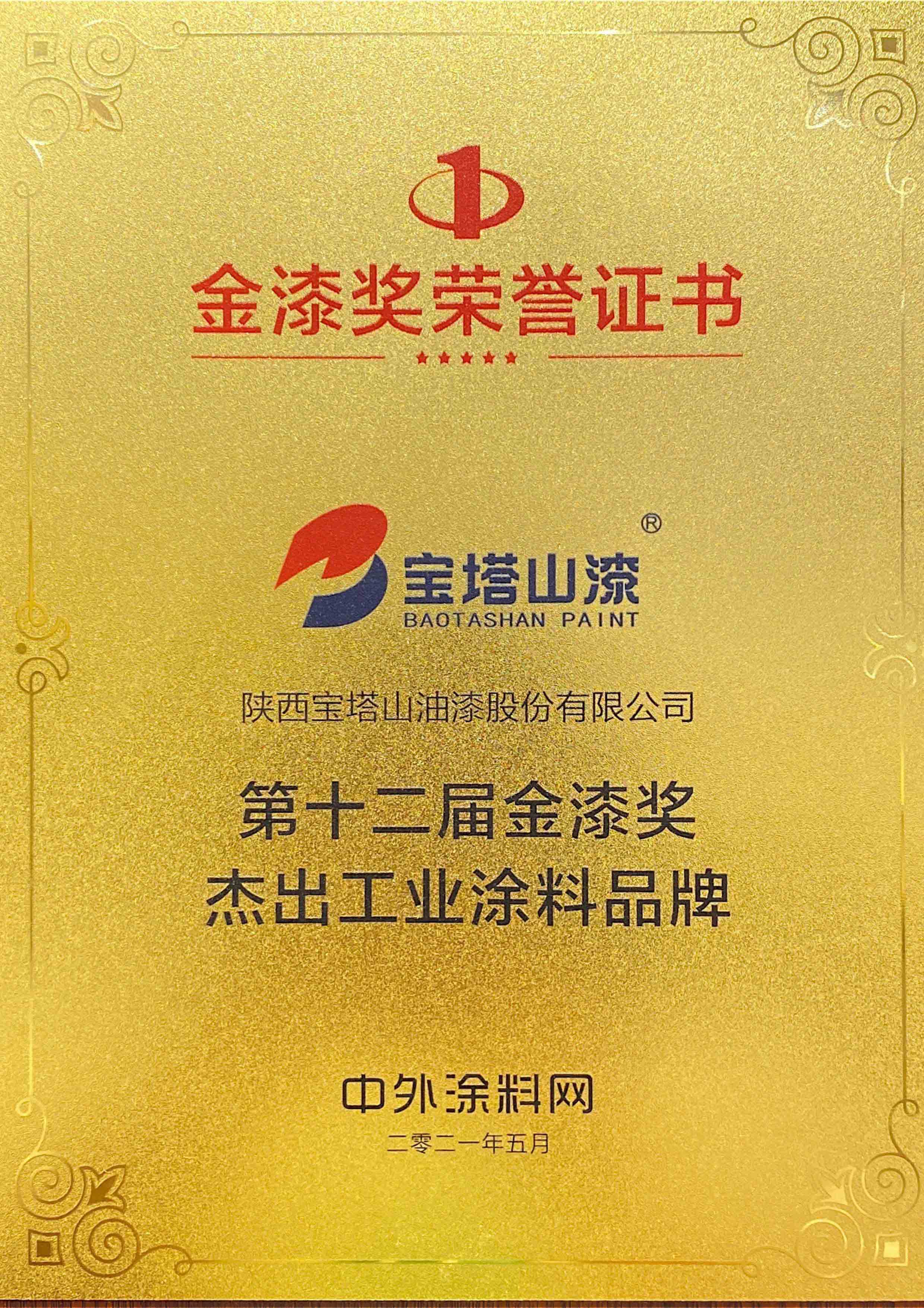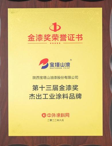 2022年6月,寶塔山漆榮獲第十三屆金漆獎“杰出工業(yè)涂料品牌”。