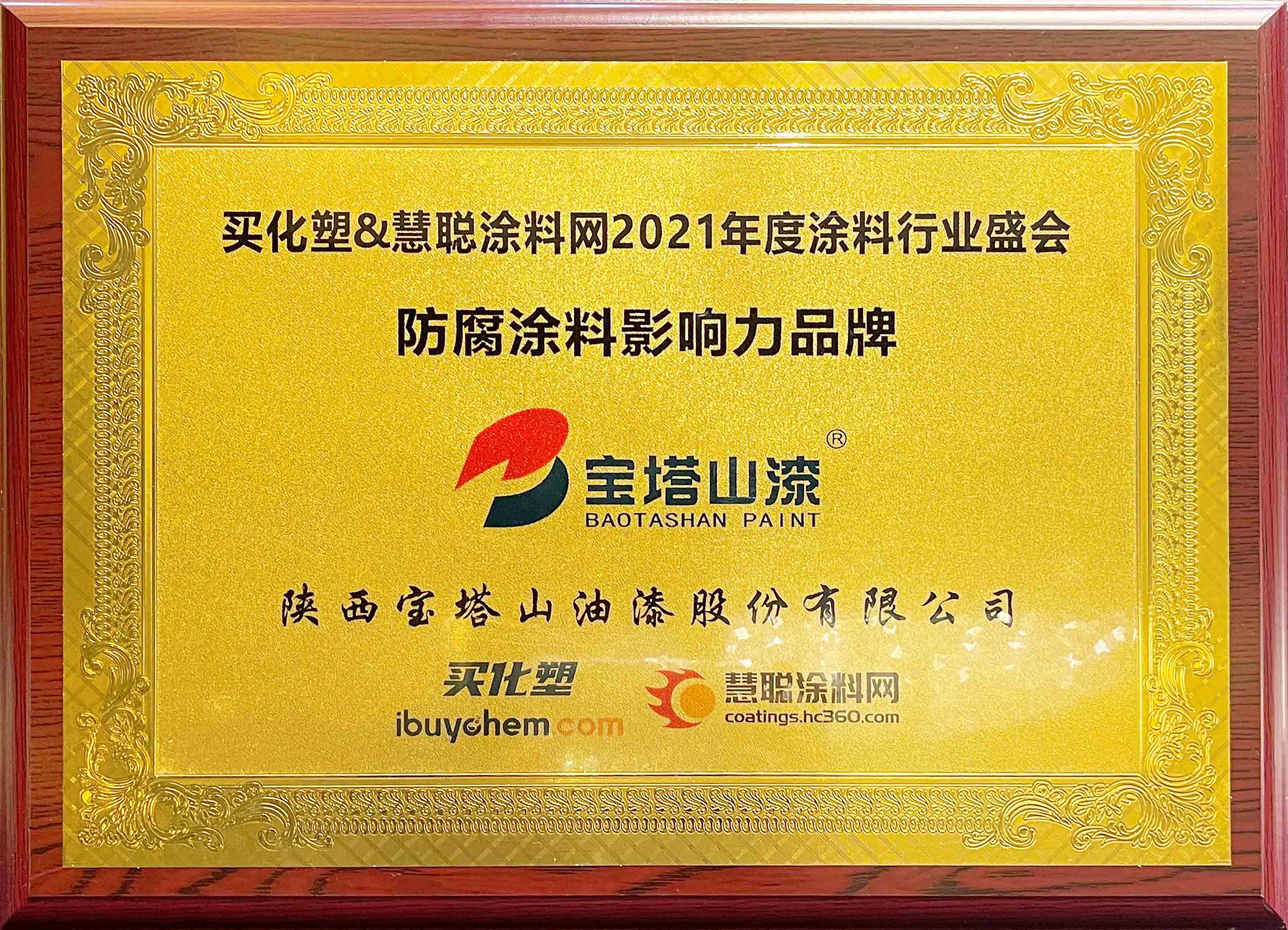 2021年6月26日,寶塔山漆榮獲2021 年度“防腐涂料影響力品牌”
