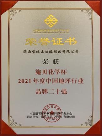 2022年3月,寶塔山漆榮獲“施貝化學(xué)杯2021年度中國地坪行業(yè)品牌二十強”。