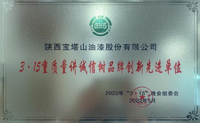 2022年5月,寶塔山漆榮獲“3·15重質(zhì)量講誠信樹品牌創(chuàng)新先進單位”。
