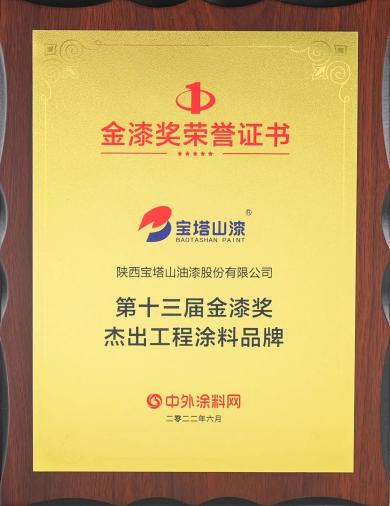 2022年6月,寶塔山漆榮獲第十三屆金漆獎“杰出工程涂料品牌”。