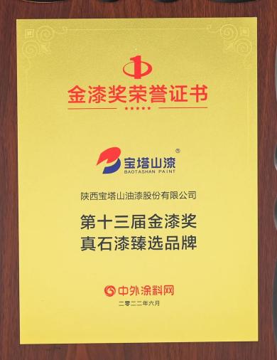 2022年6月,寶塔山漆榮獲第十三屆金漆獎“真石漆臻選品牌”。