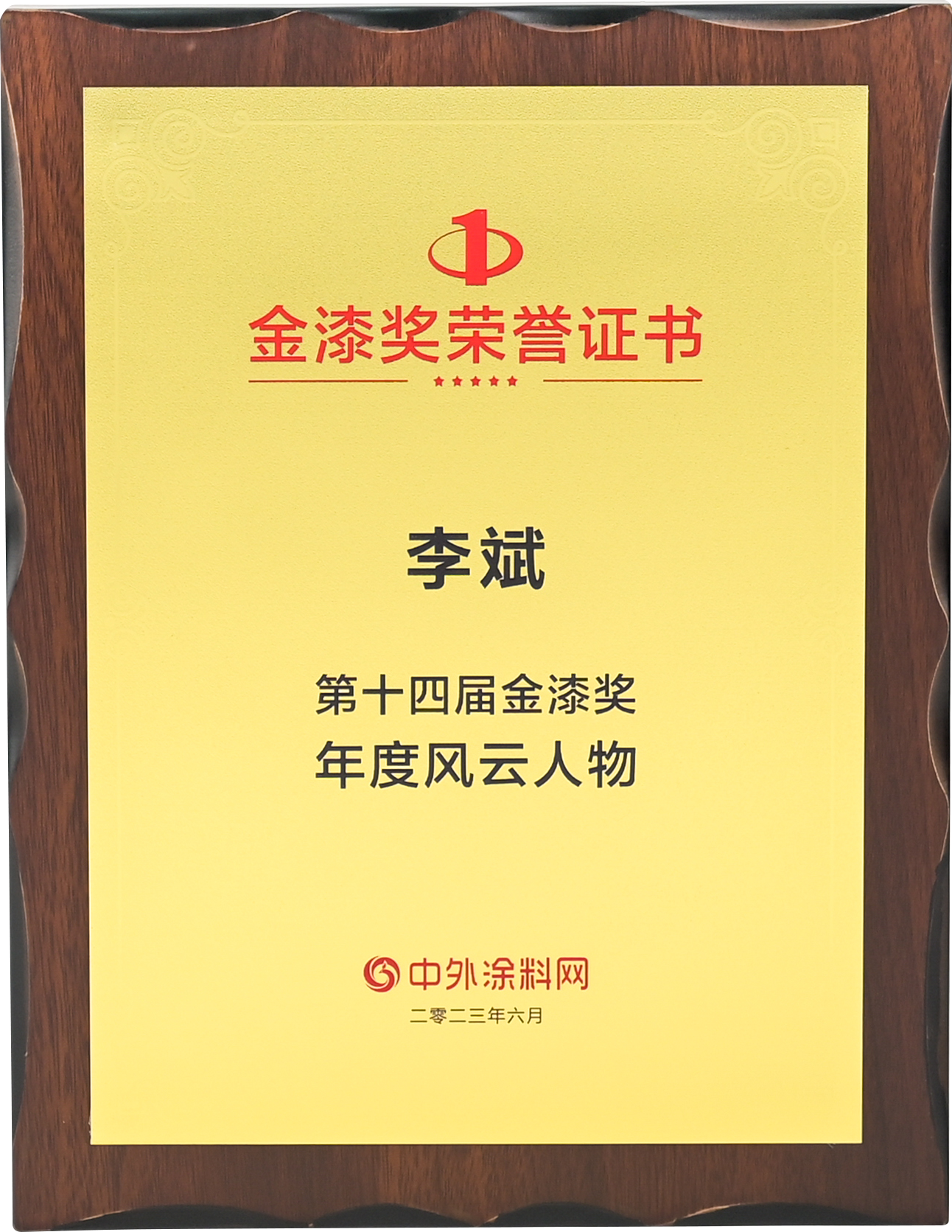 2023年6月,寶塔山漆李斌同志在中外涂料網(wǎng)第十四屆金漆獎評選活動中被評為“年度風(fēng)云人物”。